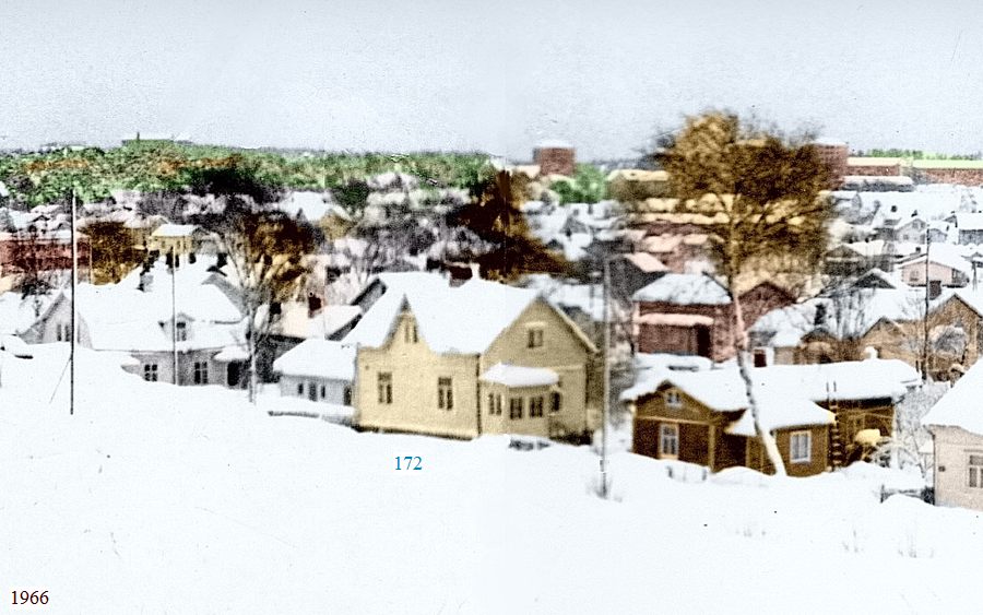 ![]() "Henrikssonin talo" kuvassa keskellä. Kuvattu Tonttumäeltä vuonna 1966. Tämä on niitä harvoja Myllymäen taloja, jotka ovat vielä olemassa ja säilyttäneet ulkoasunsa likimain alkuperäisenä! |