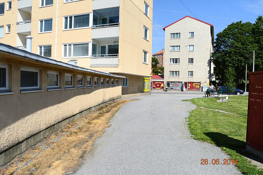 ![]() Kuja Stålarminkatu 2: talon (vas.) ja Jarkko Laineen puiston välissä. |