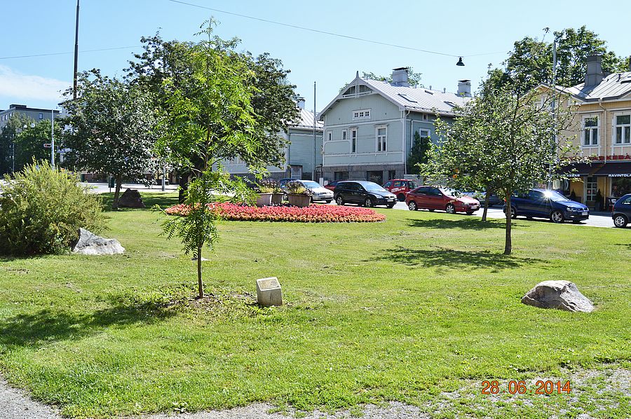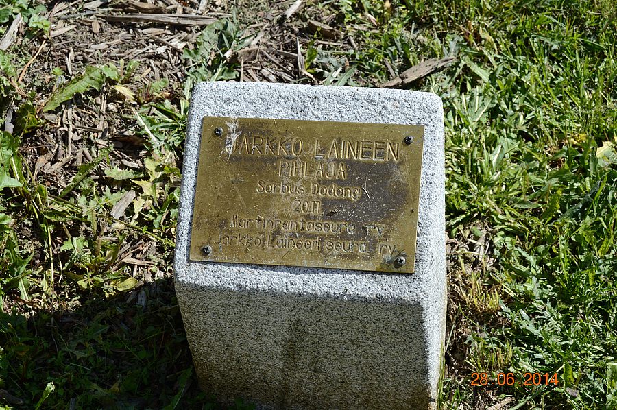 ![]() Jarkko Laineen puisto. Pihlaja ja muistolaatta. |