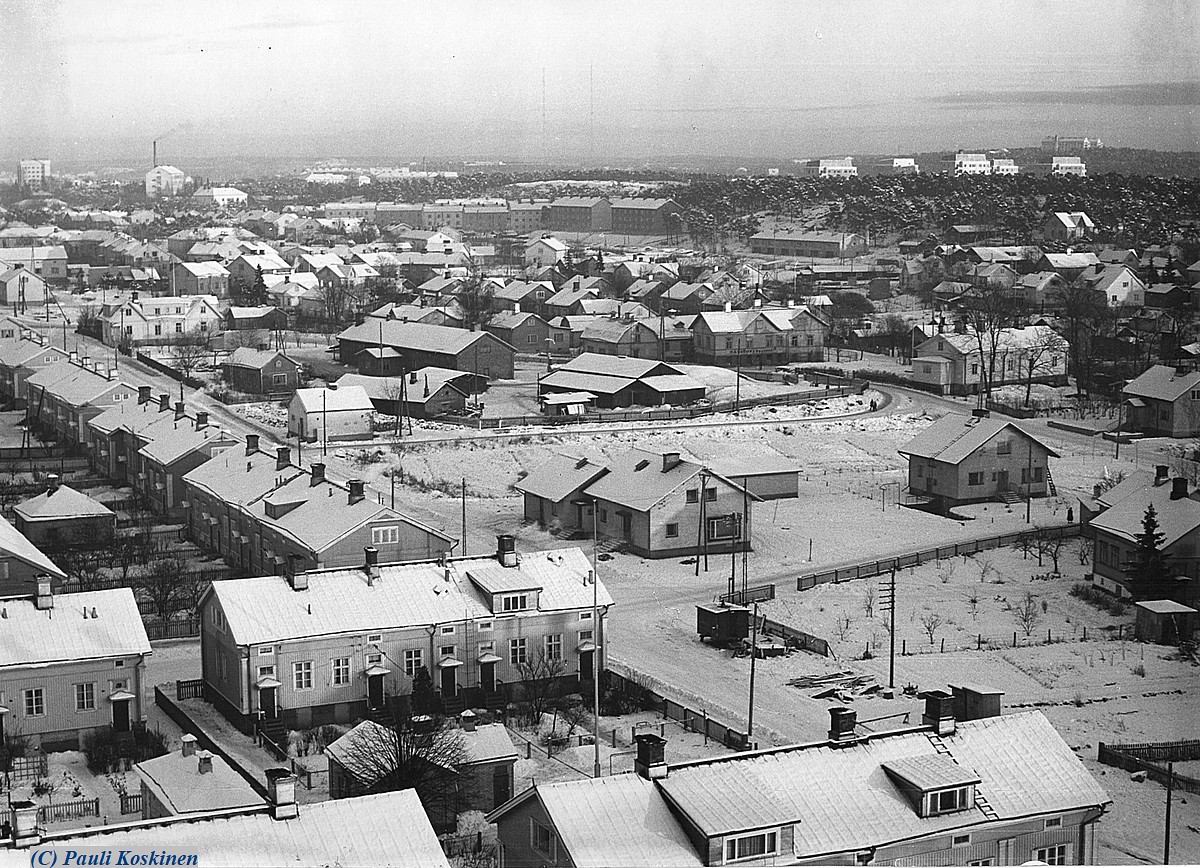Tonttulinnasta telellä kuvattua Pihlajaniemen suuntaan. Edessä Kupittaankadun taloja ja keskellä Ojarinteen aluetta. Taaimmaisena näkyy Hirvensalon taloja. Pihlajaniemessä on vielä jokunen talo tallella. |