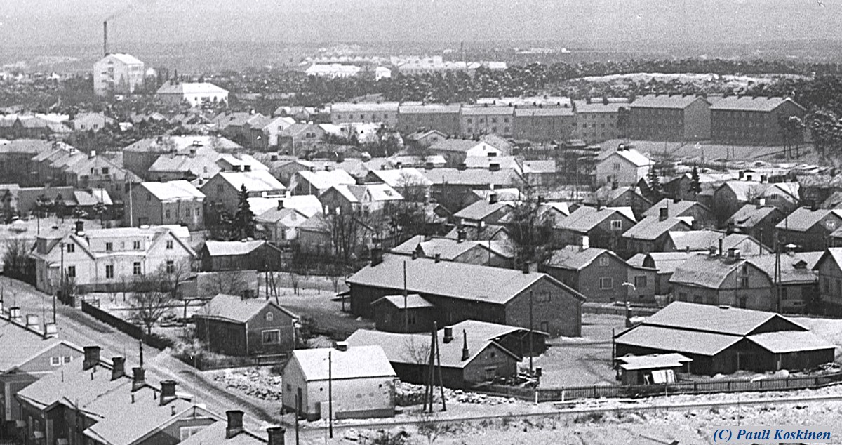 Etualalla m.m. puhtaanapitolaitoksen tallit ja vanha muuntajarakennus sekä Kupittaankatu 146 puurakennus, jossa toimi Osuuspankki. |