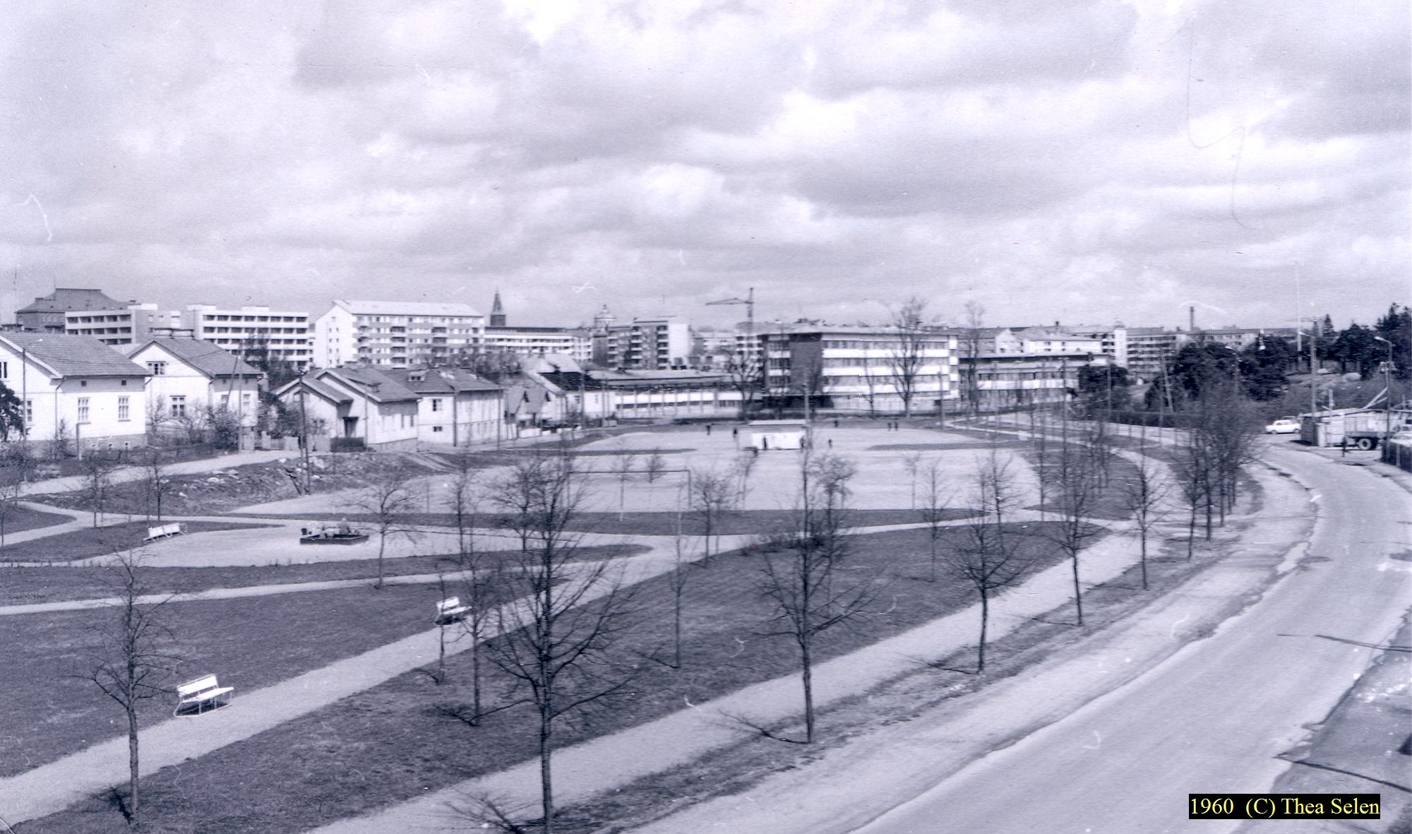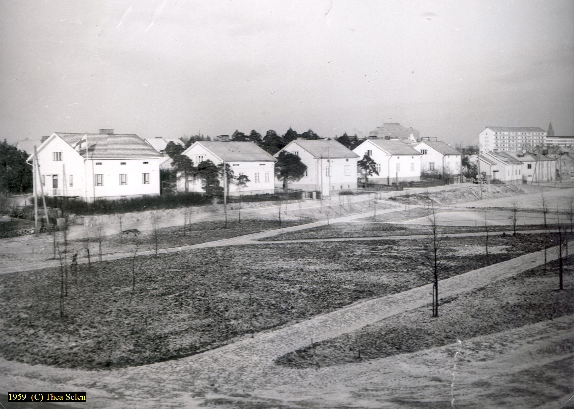 ![]() Purokadun taloja 1959. Sikaojanpuisto on jo saanut ensimmäiset istutetut puunsa. |